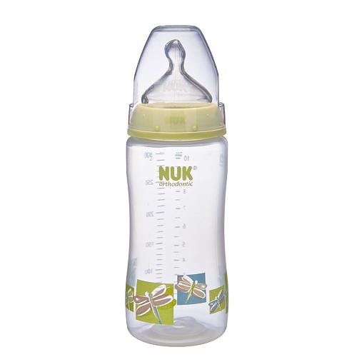 - 10 oz (300 ml). Orthodontic. BPA free. Original orthodontic nipple reduces colic & promotes healthy teeth formation. Medium flow. Silicone. Reduces colic. Orthodontic nipple. Simulates & supports breastfeeding. Nuk Air System reduces colic. Promotes healthy teeth formation. Shaped more like mother's breast. Same Nuk nipple shape. All Nuk nipples and pacifiers have the same orthodontic shape. Supports switching from breast to bottle to pacifier. All Nuk Orthodontic bottle system products are dishwasher safe, top rack only. Instructions for use and care are enclosed. Original orthodontic nipple reduces colic & promotes healthy teeth formation. Feeding hole positioned so milk mixes with saliva for good digestion. Upper face is convex to stimulate correct palate development. Flat side reinforces correct tongue position. NUK Air System vent to reduce colic. Wider base, more like mothers breast. Special Design Reduces Colic: The NUK Air System vents the bottle, preventing vacuum build up; This allows baby to drink continuously, swallowing liquid instead of air; Available in slow, medium and fast flow. Orthodontic Nipple: Is the same orthodontic shape as NUK pacifiers, designed to fit baby's oral cavity; Promotes healthy teeth formation and strengthens baby's jaw. Simulates & Supports Breastfeeding: The nipple is shaped like mother's breast during feeding; Studies show it simulates the breastfeeding experience; Supports switching between breast and bottle. Hood, collars, disc and nipples made in Germany.