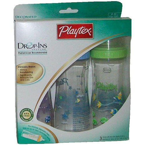 Playtex Drop-Ins System Decorated Nursers with Slow Flow Nipples, 8oz Bottles - 3 pack - boy colors The new & improved Playtex Drop-Ins bottle system is now 100% BPA and phthalate free. Clinically proven to reduce gas, colic and spit-up, it comes w/the NaturaLatch silicone nipple which is proven to support breastfeeding. Contains 3 complete Pre ...
